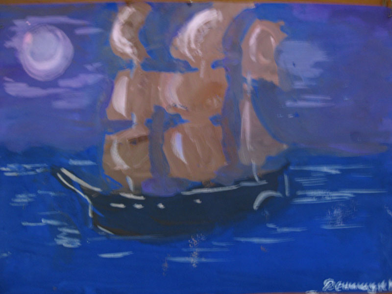 Вот, что получилось у нас. Эти картины сделали наши самые маленькие. И целых 10 дней экспонировались в начальной школе на нашем вернисаже “Юные художники-маринисты”.